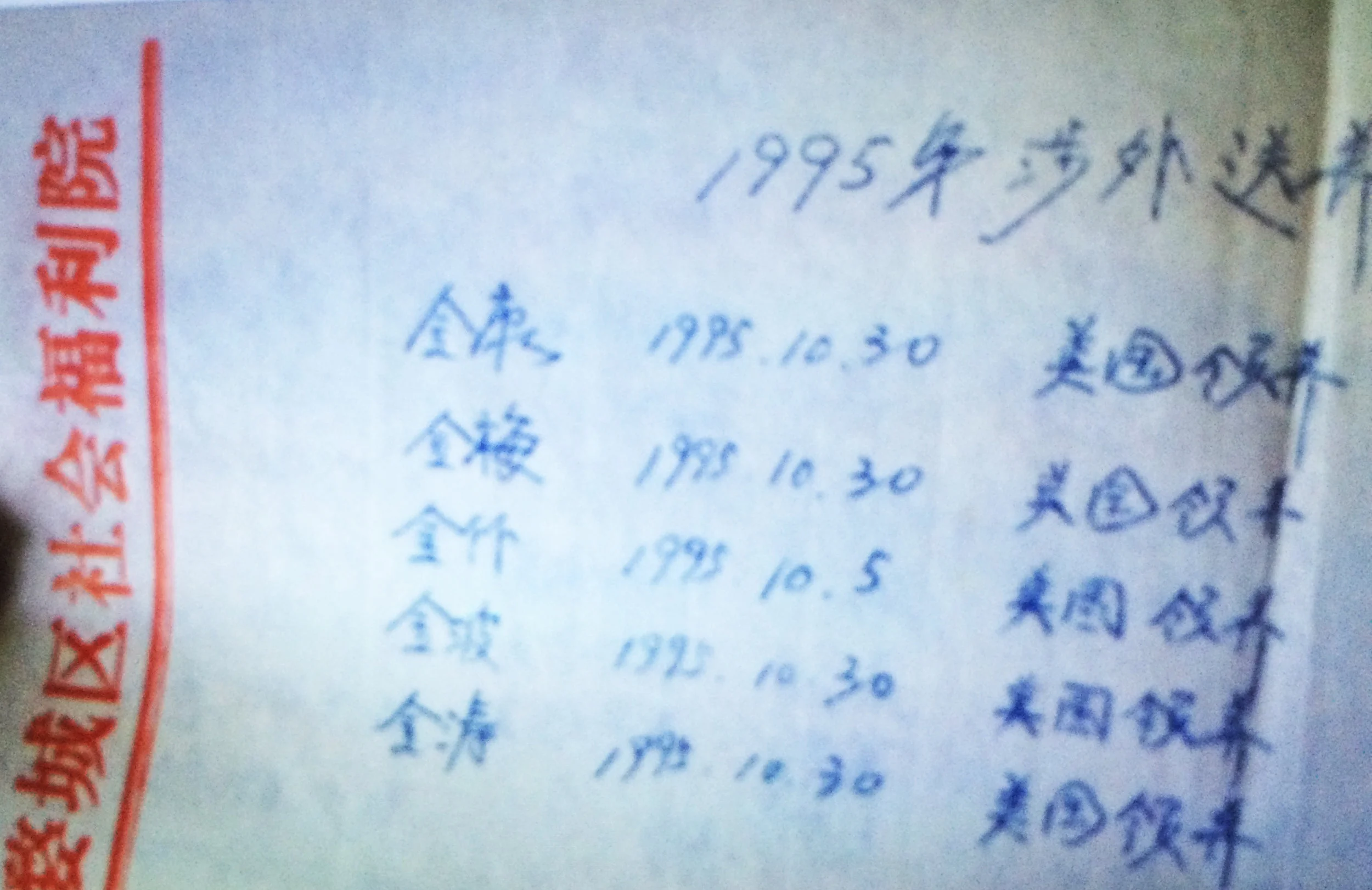 This is actually from my trip; I came back to add it here. When I visited the Welfare Institute in Jinhua, although the Director was unwilling to share any other information without authorization, he did provide us with this: a list of five children who were adopted from the orphanage to Americans (美国, or America, is the first part of the destination listed in the right column). Names are in the first column, while date of departure from the orphanage is in the middle. I am the second one down, 金梅, and there are the names of at least two other girls in my adoption group there as well. We would have left for Hangzhou.