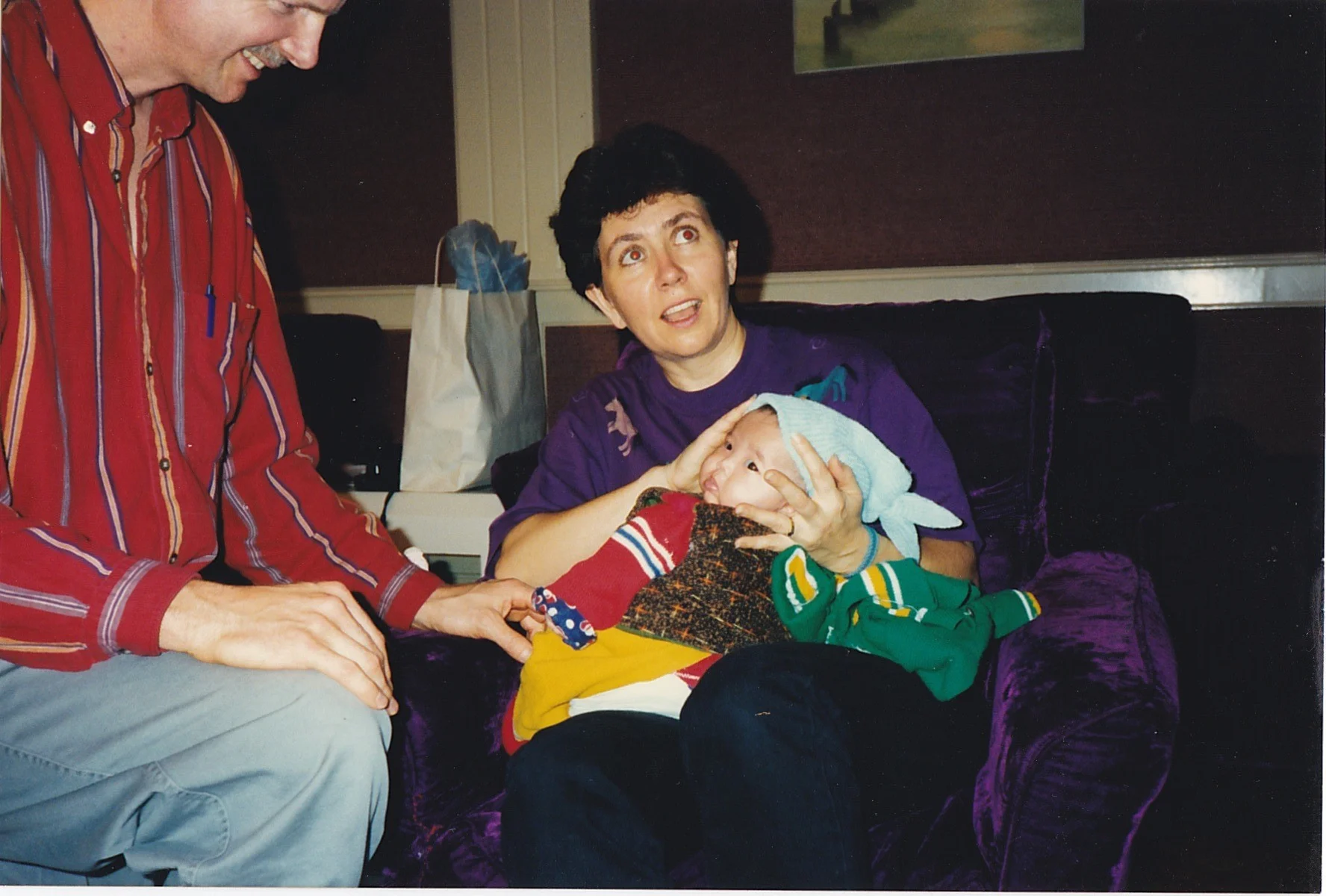 My parents, the first time they held me. I was very overdressed, very colorful, and VERY hot. Note the "Barney-purple" chairs - my dad mentions him in his interview, further in the project.