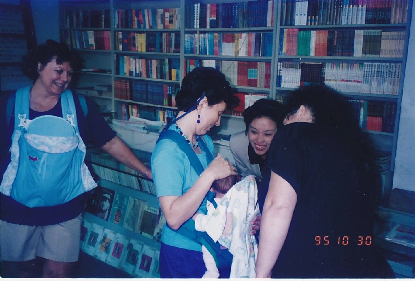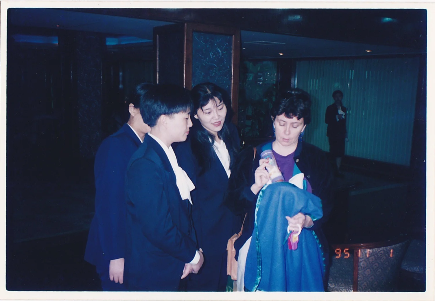 The two nannies from the Welfare Institute who brought the children in; I'm not sure if there were more. (Post-trip edit: when I visited the Welfare Institute in Jinhua, there was a woman staff member there who had a photo with her and one of the adopting parents in my group. I unfortunately didn't have this photograph to show her, but it's guaranteed she was in the room at around the same time.) This photo was taken in the Chinese Overseas Hotel, Hangzhou.